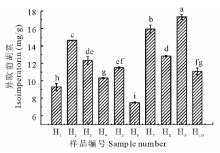图1、图2分别表示不同样地宽叶羌活中羌活醇和异欧前胡素的含量, 所有宽叶羌活中两种成分的总量均达到《中华人民共和国药典》[15]的标准, 并与地理位置相关, 呈现一定的地域性。各样点间羌活醇含量, 碌坝、甘布塔差异不大, 哈地窝村下山社和大地滩社、高庄、岗沟、中寨相近, 与其他样点均存在显著差异, 具体关系如下:枉子沟(H2)> 陈塄坎(H9)> 马营(H7)> 碌坝、甘布塔(H8、H10)> 哈地窝村下山社、高庄、岗沟、中寨哈地窝村大地滩社(H1、H3、H4、H5、H6); 各样点间异欧前胡素含量, 高庄、中寨相近, 岗沟、甘布塔相近, 与其他样点均存在显著差异, 具体关系如下:陈塄坎(H9)> 马营(H7)> 枉子沟(H2)> 高庄、碌坝(H3、H8)> 岗沟、中寨、甘布塔(H4、H5、H10)> 哈地窝村下山社(H1)> 哈地窝村大地滩社(H6)。陇南(H7、H8、H9)、甘南高原(H2、H10)各样点羌活醇、异欧前胡素总含量较高, 两地区栽培羌活的品质较优。