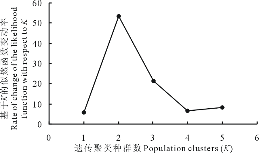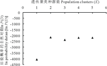 | 图3 后验概率自然对数[ln P(D)]与遗传聚类种群数(K)的关系Fig.3 Relationship of ln probability data [ln P(D)] and population clusters (K) |
