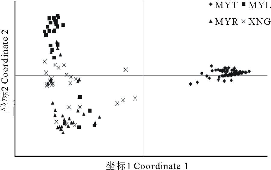 用GenAlEx软件进行高原鼢鼠居群4个不同区域163个个体基于10对SSR引物的遗传距离的主坐标分析(PCoA), 前2个极轴坐标(Coordinate)分别解释了高原鼢鼠种群整体遗传变异的47.58%和8.20%。从图 5 中可看到位于MYT样地的个体聚为一组, 而XNG、MYL、MYR三个样地的个体倾向于聚为一组。得到类似的遗传结构。