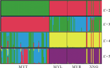| 图2 用Structure推导的4个高原鼢鼠种群遗传结构(K=2, 3, 4, 5)Fig.2 Structure analysis of 4 plateau zokor populations (K=2, 3, 4, 5) |