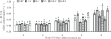 SA或ABA处理下, 随胁迫时间的延长, 醉马草幼苗MDA含量均呈上升趋势, 且与CK比较, 外源激素处理条件下幼苗MDA含量整体低于CK(图2)。CK处理下, 胁迫第6天时, E+、E-的MDA含量均达到显著(P< 0.05)水平(图2)。SA处理下, 胁迫第6天和第8天时, SA+、SA-的MDA含量达到显著(P< 0.05)水平(图2), SA+的MDA含量比SA-分别显著(P< 0.05)降低了25.4%和19.4%。ABA处理下, 胁迫第6天和第8天时, ABA-的MDA含量比ABA+分别显著(P< 0.05)提高了21.1%和34.3%。