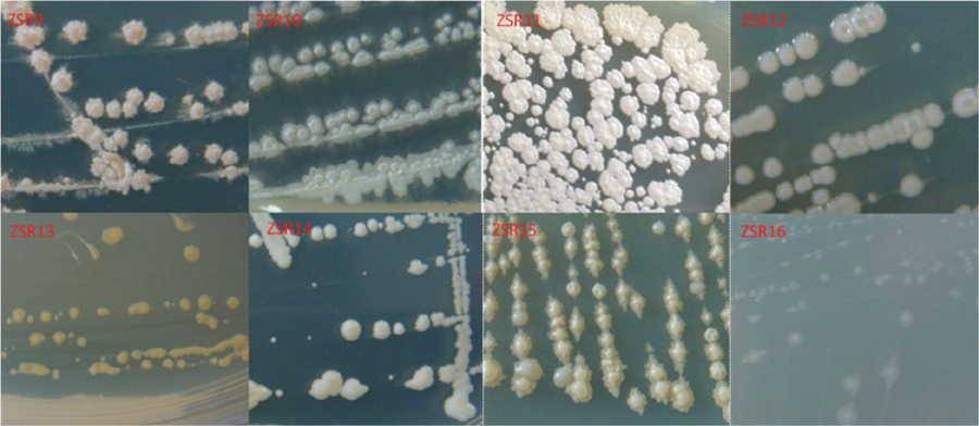 ZSR9:菌落乳头状凸起, 近圆形, 肉色, 稍有光泽, 表面褶皱, 边缘不整齐, 不透明, 略有粘度, 直径2~4 mm; ZSR10:菌落具有中凹的隆起, 圆形或近圆形, 乳白色, 稍有光泽, 边缘不整齐, 半透明, 略有粘度, 直径2~3 mm; ZSR11:菌落稍凸起的, 圆形或近圆形, 白色, 略显米黄, 稍有光泽, 边缘不整齐, 不透明, 略有粘度, 直径2~6 mm; ZSR12:菌落凸起的, 圆形或近圆形, 肉色, 有光泽, 边缘整齐, 半透明, 有粘度, 直径1~5 mm; ZSR13:菌落稍凸起的, 圆形或近圆形, 黄色, 有光泽, 边缘整齐, 半透明, 有粘度, 直径1~4 mm; ZSR14:菌落凸起的, 圆形或近圆形, 奶白色, 有光泽, 边缘整齐, 半透明, 有粘度, 直径2~4 mm; ZSR15:菌落凸起的, 不规则形, 表面有褶皱, 灰褐色, 有光泽, 边缘不整齐, 半透明, 有粘度, 直径2~4 mm; ZSR16:菌落平展, 圆形或近圆形, 白色, 有光泽, 边缘整齐, 半透明, 有粘度, 直径2~4 mm。