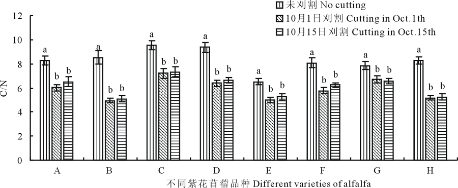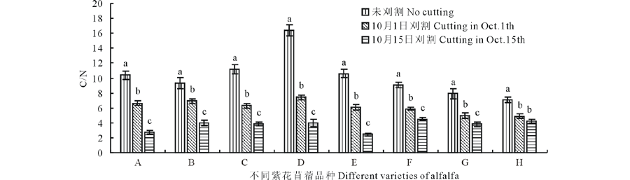C/N间接反映植物组织中非结构碳氮物质含量, 是衡量植物抗逆性指标之一, 研究表明C/N越高对植物越冬越有利[45]。本试验研究表明, 土壤冻融交替期和土壤封冻期未刈割紫花苜蓿根系中C/N显著大于不同时期刈割苜蓿根颈中含量。土壤冻融交替期, 10月1日刈割苜蓿根颈C/N显著大于10月15日刈割苜蓿根颈中C/N(P< 0.05)。土壤封冻期, 早割和晚割根颈中C/N无差异显著性(P> 0.05)。说明在土壤冻融交替期至土壤封冻期苜蓿根颈中的可溶性糖、淀粉、游离氨基酸和可溶性蛋白之间存在复杂变化过程, 通过以上对苜蓿根颈中可溶性糖、淀粉、游离氨基酸和可溶性蛋白的分析。初步得出结论:科尔沁地区紫花苜蓿不适宜秋季敏感期刈割, 若秋末刈割选择刈割后根系中C/N高的紫花苜蓿品种, 如东苜1号等。