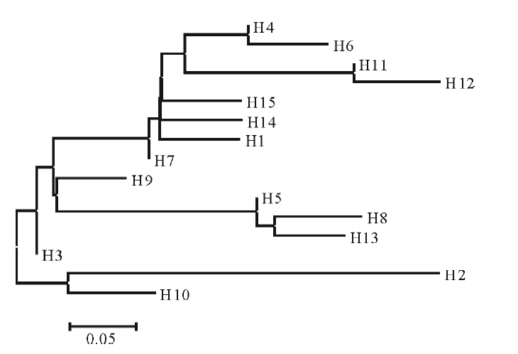 由单倍型分布可以看出, 15种单倍型中只有H5被居群Pop3和Pop7共享, H7被居群Pop2、Pop4、Pop7共享, 其他的单倍型都是地域特异性地分布在一个地点的群体中, 为各居群所特有, 说明各居群较为独立, 可能存在潜在的质粒水平的隔离[27]。
