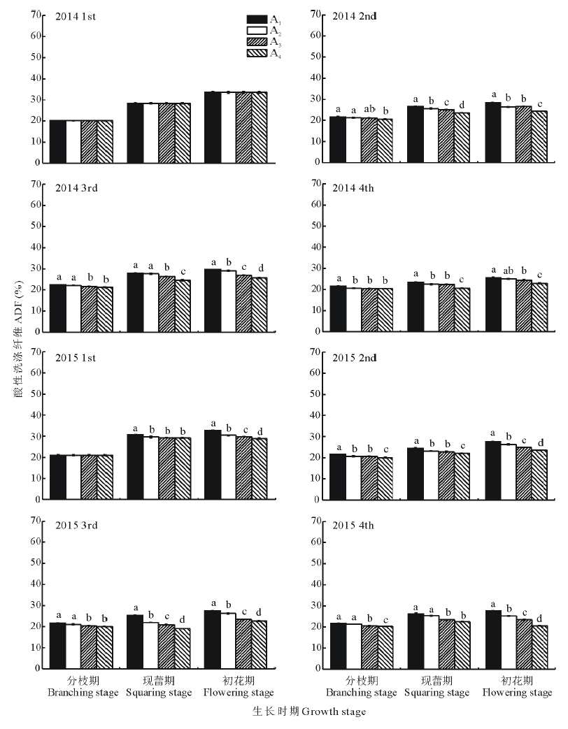 2.2.3 酸性洗涤纤维 2014, 2015年不同茬次不同处理的酸性洗涤纤维含量如图7所示, 与中性洗涤纤维的变化趋势相同, 随着紫花苜蓿生育期的推进, 各处理的酸性洗涤纤维含量呈现上升的趋势, 但各处理在不同生育期的酸性洗涤纤维含量均低于中性洗涤纤维含量, 酸性洗涤纤维含量均值由分枝期的21.01%上升至初花期的26.54%。在茬次间, 也与中性洗涤纤维的变化趋势相似, 第1茬初花期所有处理的酸性洗涤纤维含量均值最高, 为31.07%, 第2, 3茬初花期时均值低于第1茬且差别不大, 分别为26.03%和26.42%, 第4茬最低, 为24.35%。随着灌溉量的下降, 各处理在初花期酸性洗涤纤维含量呈现下降趋势, 均值由A1处理的29.08%下降至A4处理的25.29%, 在2014年第3茬, 2015年第2, 3, 4茬次中所有处理酸性洗涤纤维含量两两具有显著差异(P< 0.05)。