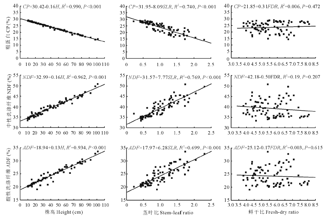 2.2.4 生长指标与品质的拟合关系 紫花苜蓿生长指标与品质的拟合关系如图8所示, 拟合结果表明, 株高与粗蛋白, 中性洗涤纤维, 酸性洗涤纤维含量的拟合关系好, P值均小于0.001, 且相关性高, R2均大于0.900, 茎叶比与品质的拟合中, P值也均小于0.001, 但其相关性低于株高的拟合结果, R2的值从0.699到0.769。此外, 虽然紫花苜蓿的鲜干比随着生育期的推进呈下降趋势, 但与粗蛋白, 中性洗涤纤维, 酸性洗涤纤维的拟合中P值分别为0.472, 0.211, 0.615, 与各品质相关不显著, R2的最高值为与酸性洗涤纤维的拟合结果, 也仅为0.615。