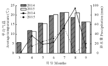 2014, 2015年紫花苜蓿生育期内的月降水量与月平均温度如图1所示。2014, 2015年生育期内的总降水量分别为243.8和145.6 mm, 为常年年均降水量的149%和89%, 2015年春季紫花苜蓿返青时气温较低, 使得紫花苜蓿的返青日期较晚, 2014年第一茬于3月23日返青, 2015年第一茬于4月2日返青。