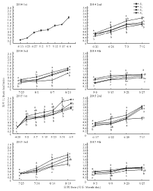 Estimating forage quality with field measurements is useful for alfalfa production. In order to investigate the prediction of quality from growth characteristics, this experiment studied the growth and quality of alfalfa under different sprinkler irrigation levels. The experiment was conducted at the Shiyanghe Experimental Station for Water-Saving in Agriculture and Ecology of China Agricultural University in Wuwei, Gansu, over a period of two years. Three irrigation levels were applied: A1 (100% measured evapotranspiration (ETc)), A2 (66% of A1), A3 (33% of A1) and A4 (a rain-fed treatment). The results showed that plant height (H) and stem-leaf ratio (SLR) increased while the fresh-dry ratio (FDR) decreased with plant maturity. All these growth characteristics decreased with lowering levels of irrigation. In terms of quality, crude protein (CP) decreased but neutral detergent fiber (NDF) and acid detergent fiber (ADF) increased with plant maturity. NDF and ADF decreased and CP increased with lowering levels of irrigation. H and SLR had a significant linear relationship with quality ( P<0.001). The coefficients of determination between quality and H ( R2>0.900) were higher than those for SLR, while the results for FDR were not significant. These results imply that, when field management is good, alfalfa height could be used to estimate forage quality.
