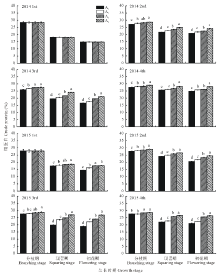 在2014年, 由于铺设喷灌设备, 所以在整个第1茬未进行灌溉, 2015年第1次灌溉在分枝期之后, 所以2014年第1茬及2015年第1茬分枝期中将各小区测定指标的平均值作为各处理指标的数值。
