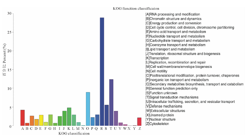 | 图2 KOG功能分类 横坐标为KOG种类, 纵坐标为基因数目所占百分比。Fig.2 KOG function classification Abscissa for KOG classification, ordinate for percent of genes number. |