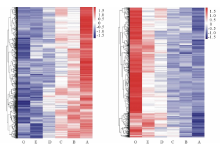 根据羊草刈割不同高度的表达量矩阵, 找到每个刈割高度处理的实验组(A、B、C、D、E)与不刈割对照组(O)表达量共有显著差异的基因24829个, 其中A(留茬0 cm)有11618个, 上调基因有7867个, 下调基因有3751个; B(留茬2 cm)有9479个, 上调基因6190个, 下调基因3289个; C(留茬4 cm)有9159个, 上调基因6031个, 下调基因3128个; D(留茬8 cm)有13375个, 上调基因10415个, 下调基因2960个; E(留茬12 cm)有7143个, 上调基因2777个, 下调基因4366个。5个实验组与对照组共有的显著差异基因2579个, 其中上调表达994个, 下调表达1585个, 这些基因极有可能与羊草响应刈割有关。