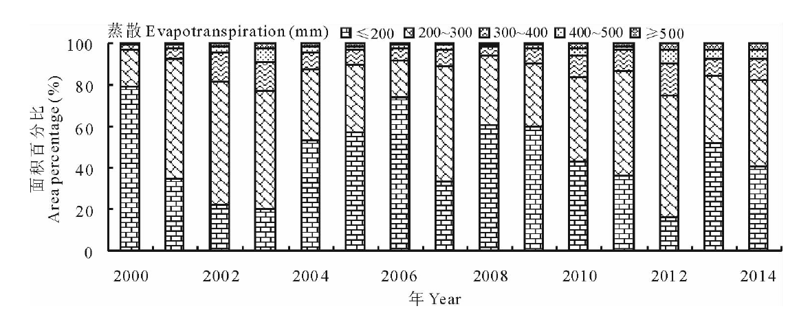 蒸散是水文-生态过程耦合的纽带,对草地生态系统的稳定性十分重要,研究生态环境脆弱地区草地生态系统蒸散变化特征对于区域农牧业发展、生态恢复与重建和构建生态屏障意义明显。基于2000-2014年MOD16地表蒸散数据,利用回归分析、相关分析和重新标度极差分析等方法,研究了宁夏草地近15年的蒸散时空分布格局与演变规律,并讨论了可能影响因素。结果表明,2000-2014年,宁夏草地蒸散量介于177.51~274.43 mm,平均值为228.03 mm;受降水的年际波动影响,全区草地蒸散量在近15年呈不显著的上升趋势( P>0.05),不同类型草地的年蒸散量和月蒸散变化动态差异明显;从空间上来看,宁夏草地的多年平均蒸散量存在较强的空间异质性,呈现南高北低的分布格局,北部最低为135.84 mm,南部最高可达732.12 mm,但波动性不强;近15年,宁夏北部草地的蒸散以下降为主,降幅自北向南递减,中部和南部以上升为主,增幅自北向南递增,但大部分区域的蒸散变化幅度较小,总体变化不显著;未来,全区草地蒸散的正向特征显著,趋势发生反转的草地比例较小;降水量是决定全区草地蒸散空间分布格局和年际波动的主要因素,人类生产活动主导的土地利用类型变化对局部蒸散的影响不容忽视。