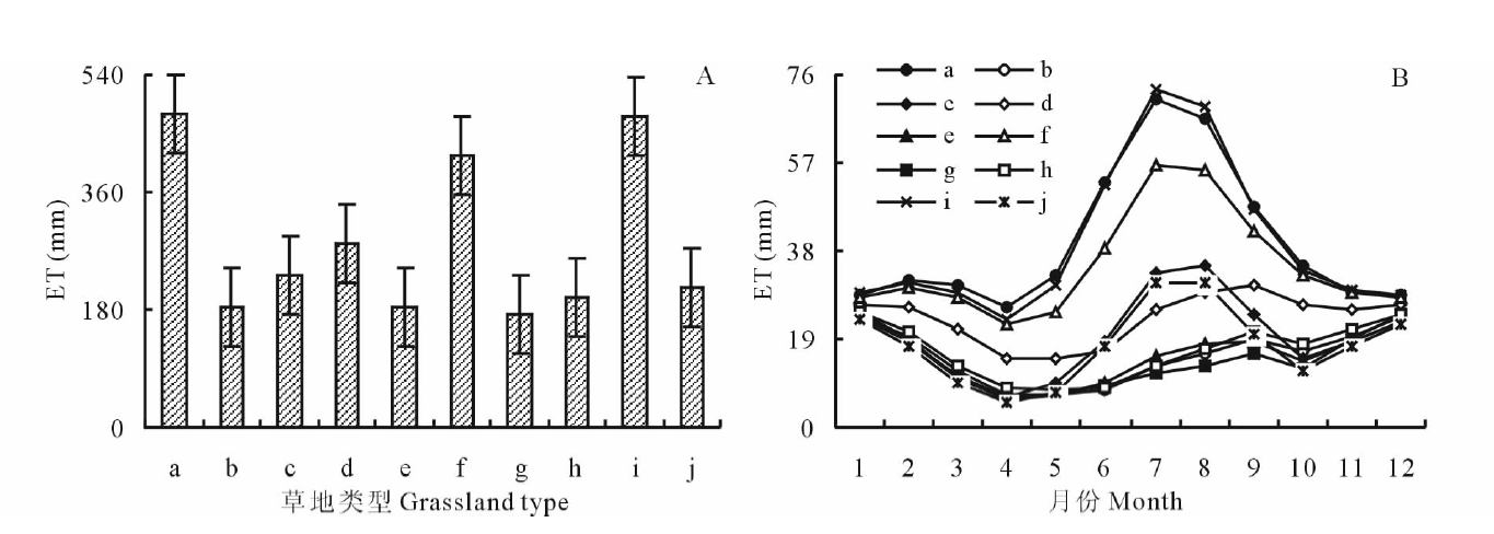 2.1.2 不同类型草地蒸散的时间变化特征 宁夏各草地类型的年平均蒸散量存在明显差异(图5A), 按照草甸草原类(479.68 mm)、山地草甸类(475.40 mm)、灌丛草甸类(415.13 mm)、干草原类(282.61 mm)、低湿地草甸类(234.04 mm)、沼泽类(214.46 mm)、荒漠草原类(197.04 mm)、草原化荒漠类(183.97 mm)、干荒漠类(182.99 mm)和灌丛草原类(172.51 mm)的顺序递减。具体来说, 主要分布于南部山区的草甸草原类、山地草甸类和灌丛草甸类草地的植被覆盖度高, 可利用水分充沛, 因而蒸散量远高于其他类型草地; 荒漠草原类、草原化荒漠类、干荒漠类和灌丛草原类草地多以旱生小禾草及小灌木为建群种, 植被盖度小, 为减少蒸腾失水, 植物叶片小而少, 蒸散较低。另一方面, 宁夏全区降水和太阳辐射有着明显的地带分异, 降水量南多北少, 气温总体北高南低, 且局域的非地带性因素更加剧了水热分异, 故分布在宁夏南部的地带性草地类型(草甸草原类和干草原类)和隐域性植被类型构成的山地草甸类、灌丛草甸类、低湿地草甸类和沼泽类草地的蒸散量较高; 而荒漠草原类、草原化荒漠类、干荒漠类和灌丛草原类草地主要分布在宁夏中北部, 这些地区的水热搭配矛盾突出, 土壤质地较差, 下渗能力强, 保水性能不理想, 土壤供水不足严重限制了这类草地的蒸散量。综上所述, 宁夏气候由南向北从中温带半湿润区向中温带干旱区过渡, 不同气候区内各草地类型的建群种和群落生境存在显著差异, 导致各草地类型的蒸散量因气候差异而存在不同的变化特征。