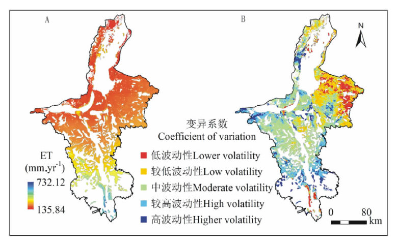 | 图6 多年平均ET空间分布(A)与波动特征(B)Fig.6 Spatial distribution of average ET (A) and its coefficient of variation (B) in study area |