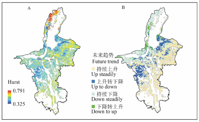| 图9 宁夏草地蒸散的Hurst指数(A)和持续性特征(B)Fig.9 Hurst (A) and sustainability (B) of inter-annual ET of grassland in Ningxia |