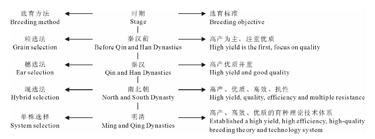 2.3.1 良种繁育技术 史前时期对于谷子品种选育虽然没有记载, 但通过考古发现, 此时谷子的籽粒大小已和现代栽培品种相近[13], 因此可以肯定在更早的时候人们就已经开始了谷子品种的选育。商周时期主要是通过挑选色泽明亮、大而饱满的籽粒来进行选种。西汉之前一直沿用粒选法选种, 《氾胜之书》“ 取禾种择高大者, 斩一节下, 把悬高处, 苗则不败” 开始了穗选法选种[6]。到了东汉“ 生于常类之中而有诡异之性, 则为瑞矣” 。“ 嘉禾生于禾中, 与禾中异穗, 谓之嘉禾” , “ 试种嘉禾之实, 不能得到嘉禾, 恒见粢粱之粟, 茎穗怪奇” , 意思就是种下嘉禾的种子, 不一定能够长出嘉禾, 而经常见到的粢、粱这类一般谷物, 有的茎穗长得很奇异(《论衡· 讲瑞篇》), 反映了先民们对谷子遗传变异的认识[14], 也是更加科学的品种选育的开始。南北朝时开始混合选种类似于今天的集团选育, 并建立“ 种子田” 专门进行种子的繁育, 形成了整套的谷子育繁种技术体系。到了明清时期育种技术取得了进一步突破, 清代时单株选择法即系选法已经被熟练应用, 而且在《康熙几暇格物编》[6]中进行了详细的描述。