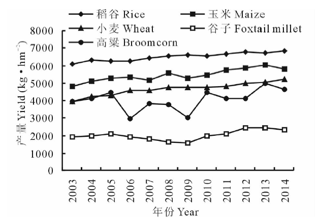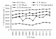 | 图4 2003-2014年谷子与几种主要作物的单产 数据来源于国家统计局。Fig.4 Yield of millet and several main crops in 2003-2014 Data from the People’ s Republic of China National Bureau of Statistics. |