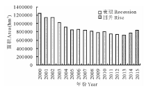 | 图2 我国谷子种植面积变化(2000-2015) 数据来源于中华人民共和国国家统计局。Fig.2 The area of millet cultivation in China (2000-2015) Data from the People’ s Republic of China National Bureau of Statistics. |