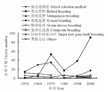 | 图3 新中国成立以来各年代不同育种技术所选育品种数 根据文献[38]和[39]整理, 农家种除外, 品种年代以审定或推广年份为准。Fig.3 The number of varieties bred by different breeding techniques since the founding of China The data come from [38] and [39], except for farm species. The year is variety approval or promotion time. |