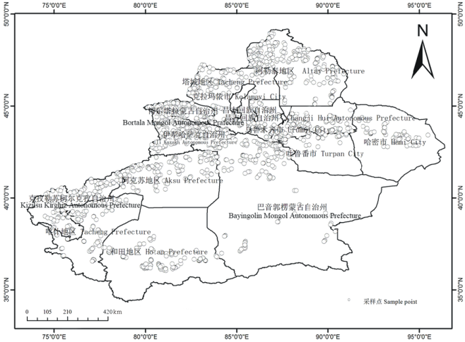 新疆地处亚欧大陆腹地, 位于东经73° 40'-96° 18', 北纬34° 25'-48° 10', 天然草地辽阔, 是我国重要的牧区之一; 新疆包括14个地、州、市, 草原面积5725.88× 104 hm2, 可利用面积4800.68× 104 hm2; 地形较为复杂, 山地和盆地交错分布, 年平均温度6.2~9.2 ℃[12], 年均降水量150 mm, 多集中在6-8月; 天山山脉位于新疆中部, 将新疆分为南疆和北疆两部分, 南北疆气候差异较大[1]。
