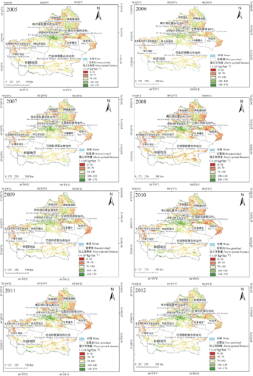 以新疆全区草地为研究对象,利用2010-2014年天然草地地上生物量实测数据(above-ground biomass,AGB)和EOS Terra MODIS每日地表反射率产品MOD 09GA,采用空间分析方法分别计算了生长季(4-10月)草地NDVImax,MSAVImax,PVImax,NDVImean,MSAVImean和PVImean 6种植被指数,探讨了NDVImax,MSAVImax,PVImax与草地地上生物量之间的遥感反演模型,分析了新疆草地生长季多年NDVImean,MSAVImean和PVImean空间分布特征和空间变化特征。根据所选的最优模型反演了新疆2005-2014年的草地地上生物量,统计分析了地上生物量的空间变化特征。结果表明,新疆草地2010-2014年NDVImean,MSAVImean和PVImean总体上均具有由北向南、由西向东逐渐递减的空间分布特点,不同草地类型的生物量差异显著。2005-2014年低地草甸类的生物量最高,高寒荒漠类最低。统计分析2010-2014年的NDVImean,MSAVImean和PVImean变化趋势发现,北疆有28%以上草地处于改善状态,南疆草地则以稳定为主;全疆14个地、州、市草地以稳定为主,处于稳定比重的草地大于40%,博尔塔拉蒙古自治州、哈密地区、塔城地区、巴音郭楞蒙古自治州草地处于改善状态的草地超过15%,阿勒泰地区、博尔塔拉蒙古自治州、伊犁哈萨克自治州直属、克拉玛依市、昌吉回族自治州、克孜勒苏柯尔克孜自治州、阿克苏地区和乌鲁木齐市轻度改善的草地比重大于10%;除吐鲁番市和乌鲁木齐市外,其余地、州、市恶化草地比重低于10%,全疆草地整体改善以稳定为主,总体趋于良好。