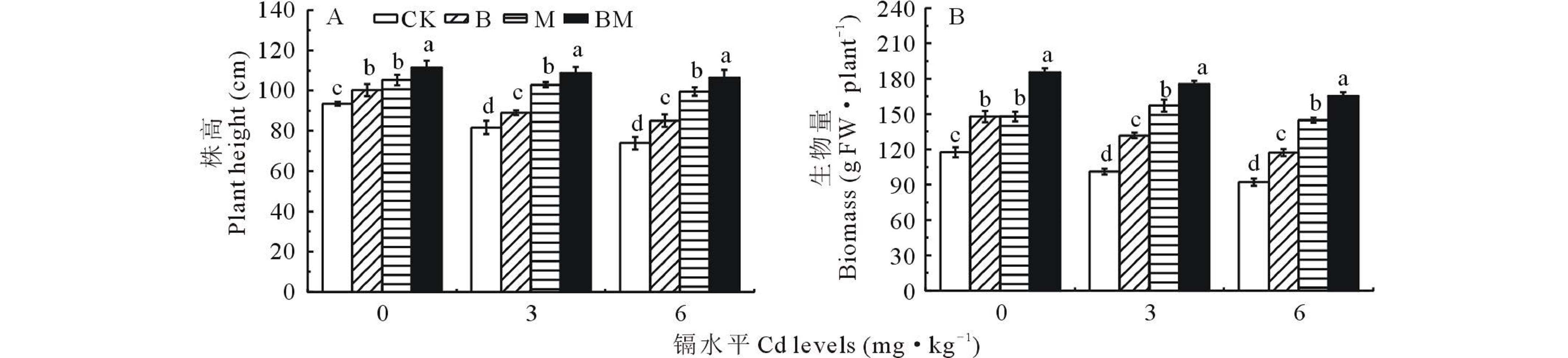 设置3个镉胁迫水平:0, 3, 6 mg Cd· kg-1。设计4个处理:对照(CK), 添加生物炭(B), 接种AM真菌(M), 添加生物炭和接种AM真菌(BM), 共计12个处理, 每个处理4个重复, 共48盆。