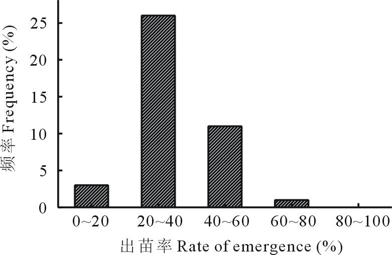通过对41份不同基因型的种子在温室内的出苗率进行测定, 结果表明不同种质间出苗率差异较大, 出苗率从10.00%到61.33%, 出苗率集中分布在20%~30%(图1), 占所有出苗种质材料的46.34%, 表明羊草种子出苗率受种质影响较大。