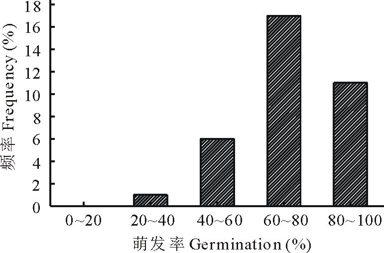 此外, 通过光照培养箱对35份羊草材料种子萌发率进行测定, 结果显示不同材料种子萌发率差异也较大, 从36.67%到95.00%, 主要集中在60%~100%, 占所有萌发种质材料的85.71%(图2), 进一步说明羊草种子的萌发率高低与种质相关。