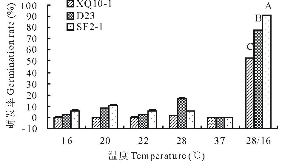 2.2.1 恒温、变温条件下羊草种子萌发规律 选取的XQ10-1、D23、SF2-1这3种羊草种质材料, 恒温处理下(16、20、22、28、37 ℃)3种材料种子萌发率均低(< 20%), 甚至萌发率为零(图3), 同一种质材料的羊草种子各恒温间的萌发率差异不显著。而变温28 ℃ (12 h)/16 ℃ (12 h), 3种羊草种子萌发率显著增加, 增幅50%~90%, 且种质间的种子萌发率也不同, XQ10-1、D23、SF2-1分别为52.50%、77.78%和90.83%, 表明变温可以显著提高羊草种子萌发率。