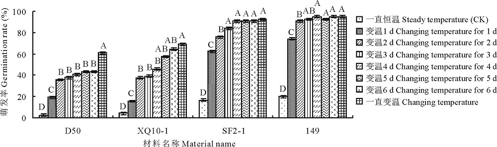 此外, 与恒温萌发对照相比, 变温处理1和2 d, 种子萌发率极显著提高(P< 0.01)。变温处理2与1 d相比, 种子萌发率有显著提高; 而处理3 d以上与前一天相比, 除SF2-1之外, 其余种质材料的种子萌发率均无显著差异。因此, 与恒温对照相比, 变温处理1~2 d即可显著提高羊草种子萌发率。
