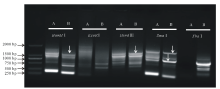 巢式PCR扩增, 引物序列如下:AD1, 5'-GTAATACGACTCACTATAGGGC-3', AD2, 5'-ACTATAGGGCACGCGTGGT-3', MBFR1, 5'-TAGTTTTAGGGATTAGGAGC-3', MBFR2, 5'-GTTGACGGCTT TCTCATCTT-3', MBFR3, 5'-TTCTTGCGGATAACGACTGG-3'。以稀释20~50倍的酶切连接产物为模板, 以AD1与MBFR1为引物, 配置PCR反应混合物(上海生工 2× Taq PCR反应试剂盒), 反应体系如下: 2× Taq PCR Mixture 10 μ L, AD1 (10 μ mol· L-1) 1 μ L, MBFR1 (10 μ mol· L-1) 1 μ L, 模板 2 μ L, dd H2O 6 μ L。反应程序为:94 ℃ 3 min, 94 ℃ 30 s, 72 ℃ 3 min, 7个循环, 94 ℃ 30 s, 68 ℃ 3 min, 32个循环, 72 ℃ 5 min, 25 ℃ 5 min, 反应结束。以稀释50~100倍的第一轮PCR产物为模板, 进行第二轮巢式PCR扩增, 引物组合为AD2与MBFR2, 反应程序为:94 ℃ 3 min, 94 ℃ 30 s, 72 ℃ 3 min, 5个循环, 94 ℃ 30 s, 68 ℃ 3 min, 25个循环, 72 ℃ 5 min, 25 ℃ 5 min, 反应结束。第三轮巢式PCR引物组合为AD2与MBFR3, 反应体系与程序与第二轮相同。