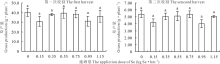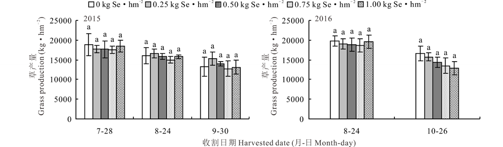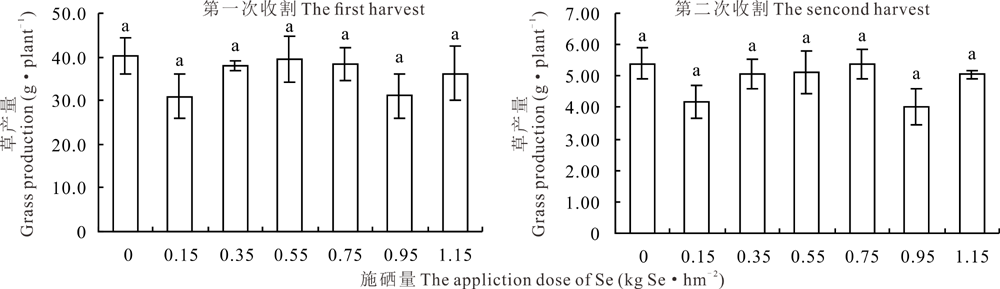 由图1可知, 硒元素对苎麻草产量无显著性影响(P> 0.05), 考虑到大田试验受外界环境影响较大, 为了减少外界环境干扰, 2016年开展了温室盆栽试验。盆栽条件下不同施硒量对苎麻草产量的影响如图2所示, 其结果与大田试验相一致, 进一步表明硒元素对饲用苎麻草产量无显著性影响。