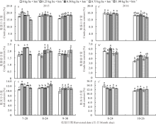 饲料中的脂肪为动物提供能量, 测定其CF含量, 可以作为鉴别其品质优劣的一个指标。2015年第1次施硒刈割后, 0.25、0.50、0.75和1.00 kg Se· hm-2处理的CF含量较对照增加2.9%、32.4%、32.4%和2.9%, 且0.50和0.75 kg Se· hm-2处理与对照间存在差异显著性; 第2次和第3次施硒刈割后, 施硒处理中苎麻CF含量与对照间均无显著性差异(图3b)。2016年第1次施硒刈割后, 仅0.50 kg Se· hm-2处理中苎麻CF含量略高于对照, 增加幅度为9.0%, 而其他施硒处理的CF含量略低于对照, 但与对照间均无显著性差异; 第2次施硒刈割后, 施硒处理的CF含量均高于对照, 且0.50 kg Se· hm-2处理与对照间存在显著差异(图3b')。