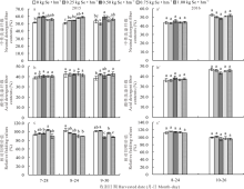 为了提高饲用苎麻营养价值,本研究采用随机区组设计,以苎麻饲用专用品种“中饲苎1号”为研究试材,通过两年大田试验和一年盆栽试验,土壤基施不同量亚硒酸钠(0、0.25、0.50、0.75和1.00 kg Se·hm-2),研究外源硒对饲用苎麻草产量、粗蛋白、粗脂肪、粗灰分、中性洗涤纤维、酸性洗涤纤维、相对饲喂价值和营养元素硒(Se)、磷(P)、钾(K)及钙(Ca)含量的调控。结果表明,外源硒对饲用苎麻草产量无显著性影响,而对其营养价值有一定的影响,但变化幅度因施硒量、年份和刈割时间有所不同。与对照相比(0 kg Se·hm-2),0.25、0.50、0.75和1.00 kg Se·hm-2处理中2年大田试验平均粗蛋白含量分别提高1.52%、0.96%、-0.10%和-4.29%;粗脂肪含量分别下降0.25%、3.93%、1.54%和9.34%;粗灰分含量分别提高1.37%、1.23%、2.29%和0.85%;酸性洗涤纤维含量分别增加1.92%、2.15%、2.32%和3.22%;中性洗涤纤维含量变幅分别为-2.97%、-0.97%、2.01%和2.63%;相对饲喂价值变幅分别为1.74%、-0.103%、-3.14%和-4.30%;Ca含量变幅分别为0.07%、-2.01%、1.27%和-0.59%;P含量分别提高7.26%、7.68%、4.63%和4.54%;K含量分别变幅分别为4.59%、12.31%、-2.04%和2.83%;Se含量随着施硒量的增加逐渐增加,最高可达到2.07 mg·kg-1。通过主成分分析结合模糊数学中隶属函数法综合评价表明,0.25~0.50 kg Se·hm-2为该地区效果最佳施硒量,有利于提高饲用苎麻的营养价值。