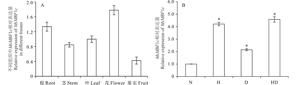 参照材料与方法中的取样时期与部位, 分析MsMBF1c在不同组织中的表达差异, 结果显示MsMBF1c在不同组织中都有表达, 其表达强度依次为:花> 根> 叶> 茎> 幼嫩角果, 花中的表达量最高, 是果实表达量的3.15倍(图1A)。在诱导表达中, 高温及干旱都能诱导MsMBF1c的表达, 与正常条件相比, MsMBF1c的表达被高温诱导了4.21倍, 被干旱诱导了2.15倍, 被高温与干旱组合处理诱导了4.59倍(图1B)。
