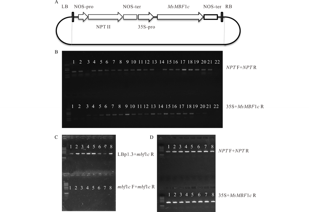 提取pEASY-MsMBF1c(gene)载体质粒, 与pBI121载体一起, 分别利用SmaⅠ 与SacⅠ 双酶切, 回收线性化的pBI121载体片段和MsMBF1c (gene)片段, 用T4连接酶(Fermentas)连接构建pBI21-35S:MsMBF1c过量表达载体, 并将该载体通过CaCl2转化法转化到农杆菌GV3101菌株备用。