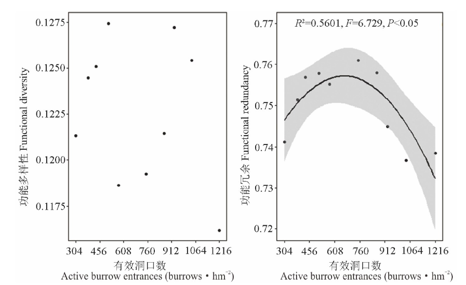 高原鼠兔干扰对植物群落功能多样性(F=0.000, df=18, P=0.004)和功能冗余(F=3.768, df=18, P=0.025)具有显著的影响, 表现为高原鼠兔干扰显著提高了植物群落的功能多样性和功能冗余(图3)。随着高原鼠兔干扰强度的增加, 植物群落功能多样性和功能冗余变化过程并不一致, 其中功能冗余表现出单峰变化趋势, 且在中度干扰下植物群落功能冗余最大(图4), 而植物群落功能多样性无明显的规律。