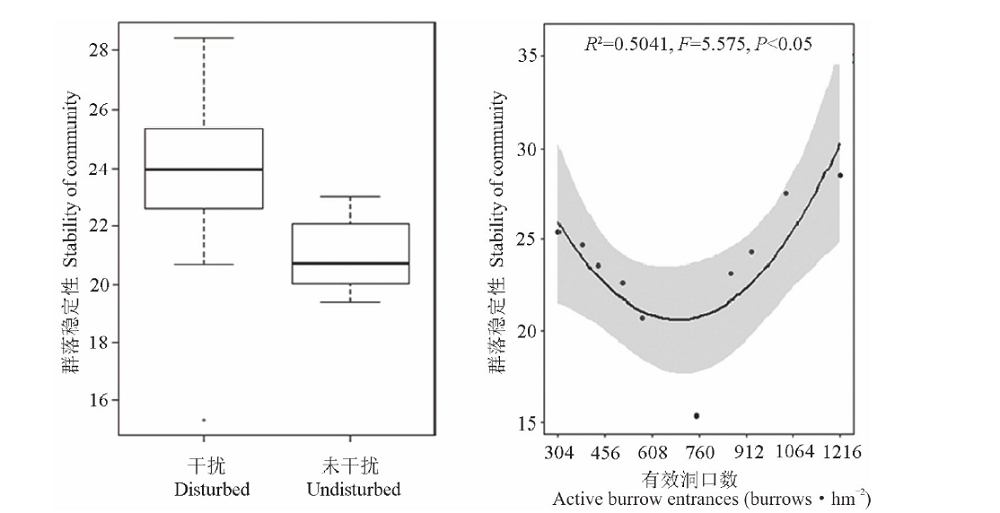 稳定性是植物群落结构与功能的一个综合特征, 包括抵抗力稳定性和恢复力稳定性等[1, 2]。植物群落稳定性对草地生态系统可持续性具有重要的影响[3], 被视为评价生态系统健康的重要指标之一。虽然评价植物群落稳定性方法众多, 但物种多样性被认为是决定性因素之一[2, 3]。目前关于植物多样性与稳定性关系的假说尚未形成共识, 主要包括正相关、负相关和不相关3种模式[1], 但是Ives等[4]系统地对52个研究结果进行分析, 发现有69%的研究报道了多样性与稳定性呈正相关模式。植物多样性与稳定性呈正相关关系始于Elton[5]提出的生态系统越简单越不稳定, 主要是因为物种多样性越高, 生态系统抵抗外界干扰因子能力越强, 植物群落则越稳定[6]。同时物种冗余比多样性更能解释植物群落稳定性[7, 8], 因为冗余种的缺失不会影响植物群落稳定性, 但影响物种多样性, 主要是不同物种在植物群落中的作用和地位不同所致。然而, 植物群落内物种的地位和作用经常随着外界干扰而发生变化, 某一组分过度扩展或萎缩必然联动影响其他组分的变化, 一定程度上能够改变植物多样性, 引起冗余种变化或改变冗余种位置, 从而对植物群落稳定性产生影响。因此外界干扰, 特别是生物干扰, 对草地植物群落稳定性的影响成为生态学和草学研究领域的重要内容[9, 10]。
