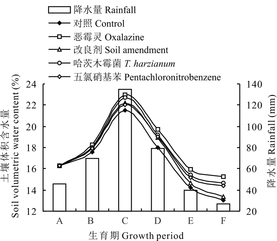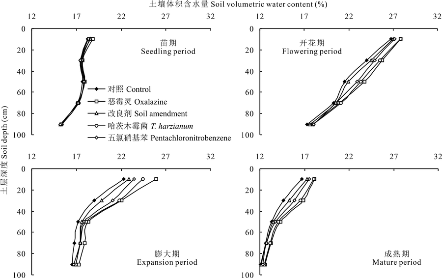 2.3.2 不同处理对连作马铃薯土壤水分垂直变化影响 在苗期0~20 cm土层中恶霉灵处理土壤含水量相对较高, 其余处理各土层差异不明显, 相互交织在一起(图2)。由于开花期降水量的增大, 土壤水分含量总体增高, 在20~60 cm土层中各处理土壤水分含量差异明显, 恶霉灵处理的土壤水分含量最高, 其次为哈茨木霉菌处理, 再次为五氯硝基苯处理, 之后为改良剂, 对照最低, 其他土层各处理的差异不明显, 0~20 cm土层差异不明显与降水量大有关。在块茎膨大期由于降水量减少, 马铃薯需水量增大, 在0~60 cm土层中各处理土壤水分含量差异明显, 恶霉灵在各土层的土壤含水量相对较高, 对照在各土层的土壤含水量最低, 在0~60 cm土层中哈茨木霉菌、改良剂和五氯硝基苯土壤水分含量差异开始明显。在马铃薯成熟期由于降水量减少, 土壤含水量总体降低, 不同处理间各土层土壤水分含量差异越明显。