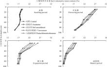 | 图 2 不同处理连作马铃薯主要生育期0~100 cm 土层土壤含水率垂直变化Fig.2 Soil water moisture changes in 0-100 cm soil profile of different treatments during potato growth period |
