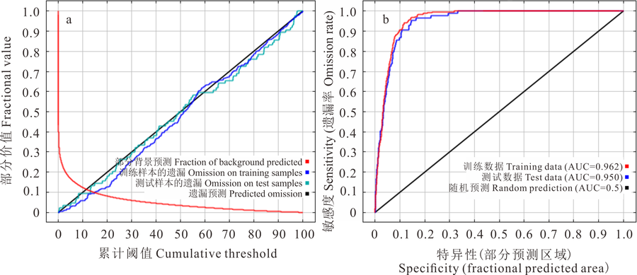 图2a显示了测试数据和训练数据的遗漏曲线与预测区域遗漏曲线随累积阈值的变化情况, 实测遗漏率最大程度接近于预期的遗漏率时, 代表模型拟合效果最佳。在本研究中, 实测遗漏曲线与预测遗漏曲线几乎重合, 表示模型的可靠性极佳。为了进一步测试Maxent的预测精度, 本模型使用受试者工作特征(ROC)曲线进行检验模型精度, 由图2b可知, 训练数据的AUC值为0.962, 测试数据的AUC值为0.950, 表明Maxent模型预测结果可靠性极佳, 其对长芒草的潜在分布的预测是非常准确的。
