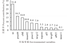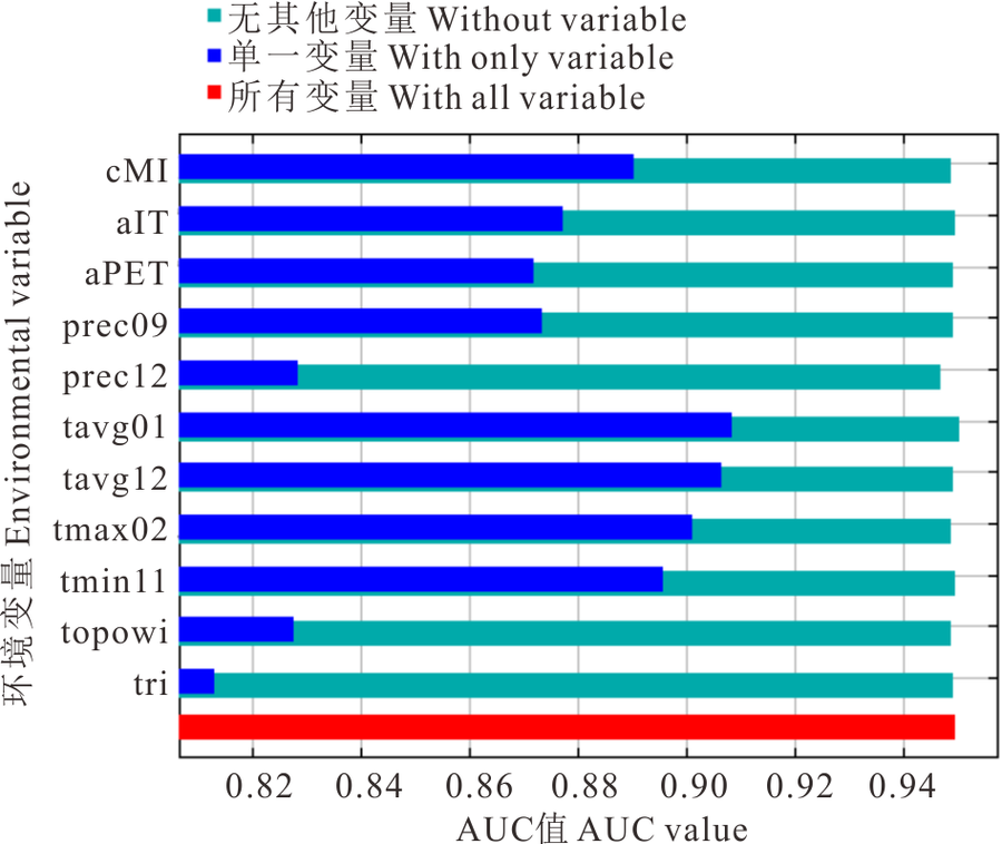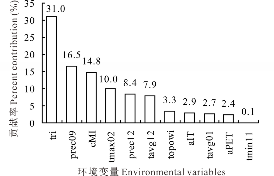 对Maxent模型中各环境变量贡献率的统计结果表明(图3), 共有6个环境变量对模型的影响贡献率大于5%, 由高到低依次为地形粗糙度指数(tri, 31.0%)、9月降水量(prec09, 16.5%)、气候湿度指数(cMI, 14.8%)、2月最高温度(tmax02, 10.0%)、12月降水量(prec12, 8.4%)和12月平均温度(tavg12, 7.9%), 其累积贡献率达88.6%, 是模拟长芒草适生区主要的环境变量, 能反映其最适生境分布的大部分信息; 同时, 所有筛选出的变量, 在模型中都有不同的贡献率, 贡献最小的变量为11月, 最低气温也在0.1%左右, 说明没有无关变量参与Maxent模型分析, 可见该筛选方法对构建Maxent物种分布模型环境过程中的变量筛选是十分有效的。