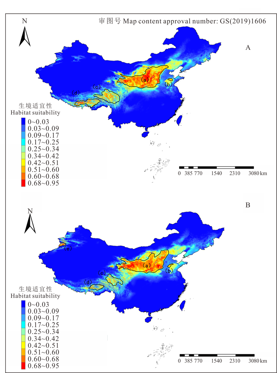 图5B是2070年RCP8.5气候情景模式下长芒草生境适宜度分布图, 很明显与RCP2.6的相比, a区最适宜分布面积减少, 且更为分散, 由黄土高原中部往东西两边扩散, 主要集中在山西省南部以及青藏高原东北部。b区面积减少且发生西移, c、d两区的面积进一步减少, 且生境适宜性0.68以上的区域与当前气候下和RCP2.6情景模式相比, 分布范围缩小, 青藏高原整体的中适分布区域增加, 一直延伸至青藏高原南部, 但低适区域减少, e区是位于新疆北部天山山脉的分布区域, 相比当前气候下分布区面积整体减少, 但是在伊犁河谷附近出现了一部分0.68以上的最适分布区。山东、河北、辽宁三省的大部分地区都成了长芒草的低适分区, 整个东北地区及内蒙古北部的低适生区域大面积减少。