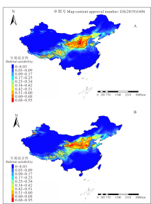3)长芒草栖息地适宜性的Maxent结果表明, 在气候变化的背景下, 长芒草的最适潜在分布区整体明显减少, 大部分的低适宜分布区消失, 且长芒草高适宜度栖息地向中适宜度转变。