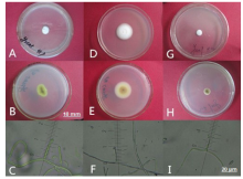 从玉树藏族自治州称多县和海南州同德县同德牧场两个异针茅地理种群分别挑选的10株单株内生真菌带菌率为81%和90%。同时, 从20个单株中成功分离出3株内生真菌菌株; 其中, 玉树异针茅种群分离内生真菌编号为Yssa 5和Yssa 9, 从同德异针茅地理种群分离内生真菌编号为Tdsa。25 ℃黑暗条件培养下, PDA培养基上菌落生长缓慢, 平均生长速率为0.524 mm· 周-1; 其中, Yssa 5编号(图1A, B)的菌落正面气生菌丝分布稀疏, 白色。边缘暗黄色蜡状环, 反面黄色; Tdsa编号(图1D~E)菌落正面菌落白色, 气生菌丝发达由中央向四周变稀疏, 反面淡黄褐色, 由中央向边缘变浅; Yssa 9编号(图1G~H)菌落正面气生菌丝稀疏, 表面呈奶黄色, 边缘有蜡质, 中心凹起, 反面暗褐色, 边缘颜色变浅。分生孢子单生于分生孢子梗顶端, 椭圆形、肾形、弯月形、梨形, 3种编号的分生孢子平均大小为3.247 μ m× 6.628 μ m; 分生孢子梗基部单生或基部生成两个分支, 平均长为26.669 μ m, 基部宽为2.721 μ m, 顶端宽为0.980 μ m (图 1C、F、I)。以上特征均符合Epichloё 属内生真菌特征。
