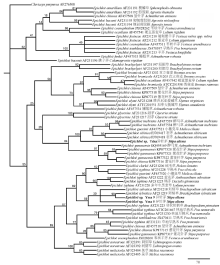 综上所述, 异针茅所感染的内生真菌初步鉴定为E. gansuensis、E. inebrians、E. sylvatica, 异针茅与内生真菌间未形成严格的宿主特异性, 表现出内生真菌多样性, 这可能与生长环境、宿主和感染的内生真菌基因型等因素有关。由于本研究仅对青海高原两个地理种群异针茅的内生真菌进行形态观测和系统发育树构建, 且未进行多个样本基因组多样性的分析; 所以, 后续的研究还需要扩大异针茅的检测范围, 以及需要进一步验证异针茅内生真菌基因多样性, 以此来揭示异针茅内生真菌的起源和分化过程。