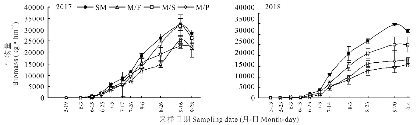 与3种豆科作物间作的玉米地上部生物量均小于单作玉米(图 2), 采样前期, 各间作模式中玉米生物量无显著差异, 6 月中下旬后, 各种植模式中玉米生物量出现差异, 3种间作模式中, M/S中玉米生物量显著高于M/F和M/P; 至收获期, 玉米生物量均表现为SM> M/S> M/P> M/F, M/F、M/S和M/P中玉米的生物量分别达到SM生物量的77.0%、92.5%、80.1%(2017年)和50.0%、79.8%、56.6%(2018年)。