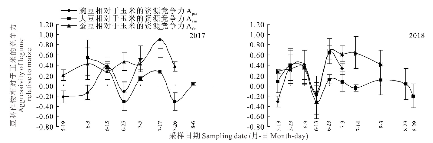 两年试验结果显示, 豆科作物相对于玉米的资源竞争力(Alm)呈现波动变化, 但大豆相对于玉米的资源竞争力(Asm)随共生期推进逐渐降低, 豌豆相对于玉米的竞争力(Apm)和蚕豆相对于玉米的竞争力(Afm)均呈上升的态势(图3)。2017年, Asm由0.55下降到0.03, Apm从-0.22上升到0.52, Afm从0.20上升到0.32; 2018年, Asm由0.09下降到-0.20, Apm从-0.31上升到0.33, Afm从0.28上升到0.42。