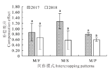 不同间作模式下玉米补偿效应无显著差异(图4)。玉米的CE值除2017年M/S中大于1以外, 其余均小于1。不同间作模式下两年平均CE值均小于1, 分别为0.77(M/F)、0.92(M/S)和0.70(M/P)。
