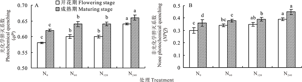 2.1.3 施氮量对柳枝稷叶片的PSⅡ 光化学猝灭系数和非光化学猝灭系数的影响 柳枝稷叶片的PSⅡ 光化学猝灭系数(qP)随着施氮量的增加而呈现递增的趋势(图3A)。在开花期, 柳枝稷叶片qP在N240处理下最大, 为0.64, 显著高于其他各施氮处理(P< 0.05)。N60、N120和N240较N0处理分别提高了3.45%、3.46%和10.34%, 其中N60和N120处理之间没有显著差异(P> 0.05)。在柳枝稷成熟期, 叶片的qP在N240处理下最大, 为0.66, 显著高于其他各施氮处理(P< 0.05)。N60、N120和N240较N0处理分别提高了3.23%、3.24%和6.45%, 其中N60和N120处理之间差异不显著(P> 0.05)。